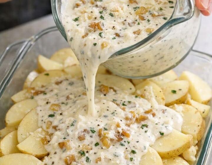 There are simple potato dishes… and then there are rich, creamy, oven-baked Parmesan potatoes that completely transform an everyday ingredient into something unforgettable. This dish is all about comfort food at its finest—crispy on the outside, soft and velvety on the inside, and infused with a luxurious blend of garlic, butter, cream, and cheese.